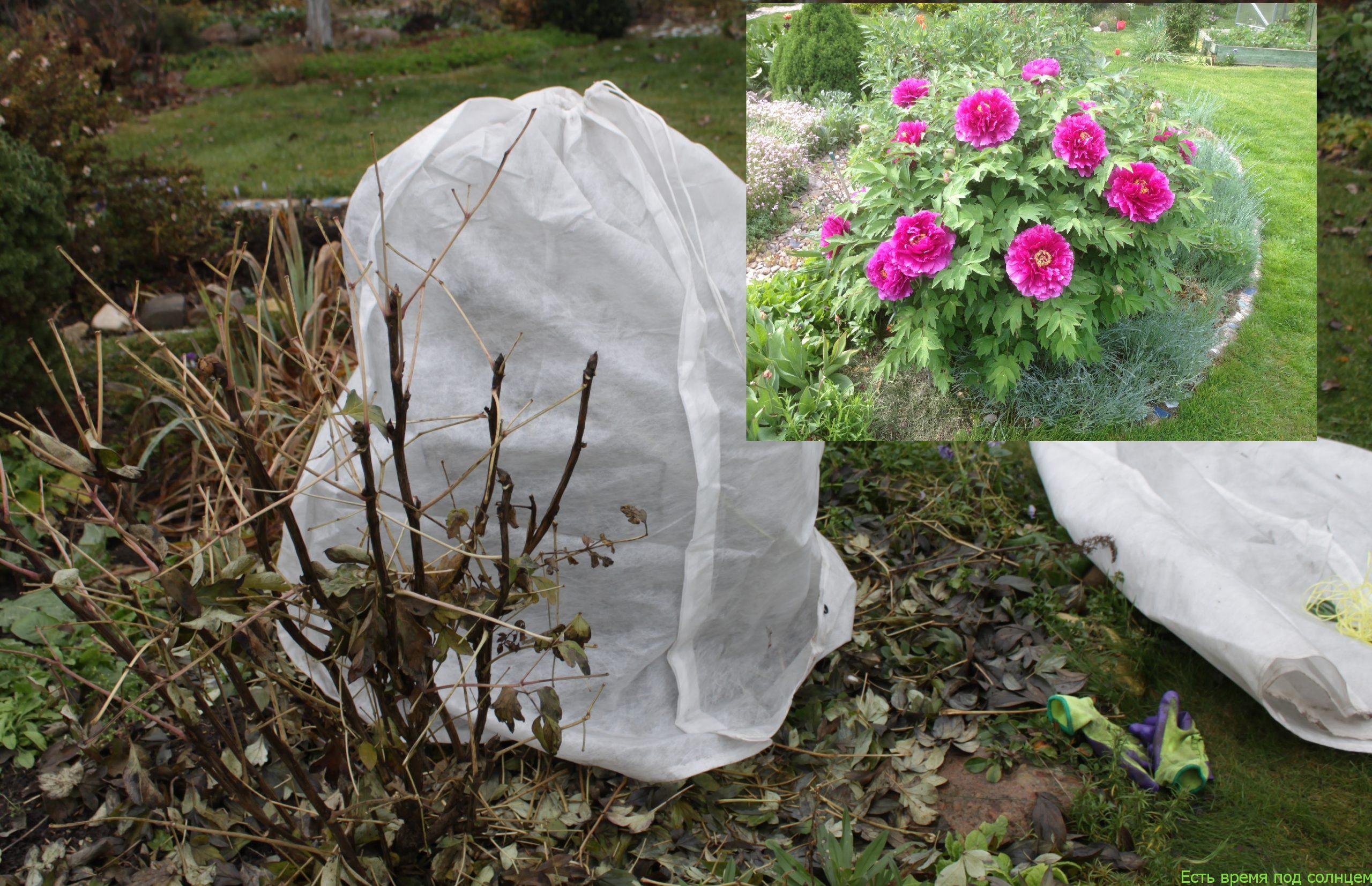 Пионы утепляются перегноем или перепревшим навозом, толщиной 10-15 сантиметров. Молодые растения дополнительно накрываются слоем лапника.
