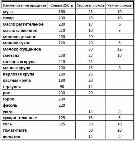 Таблица объёмов 1 стакан — 240 мл. 3/4 стакана — 180 мл. 2/3 стакана — 160 мл. 1/2 стакана — 120 мл. 1/3 стакана — 80 мл. 1/4 стакана — 60 мл. 1 ст. л. 15 мл. 1 ч. л. — 5 мл. 1 ст. л. -3 ч. л. 1 стакан-16 ст. л. 1 литр-4 стакана +2 ст. л. [Соотношение-вес/объём различных продуктов. Масло. 1 стакан растительного масла-200 гр. 1 стакан сливочного масла -240 гр. 1 с. л. сл. масла-15 гр. Мука, какао, крахмал. 1 стакан обычной или самовосходящей муки -140 гр. 1 ст. л. -10 гр. 1 ч. л. 3 гр. 1 стакан цельнозерновой муки-125 гр. Сахар белый.