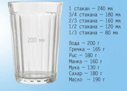 Важно: во многих кулинарных рецептах, если указано, что нужно взять определенное количество стаканов какого-то ингредиента, имеется ввиду 200 граммовый стакан, наполненный до верху (до каёмки).
