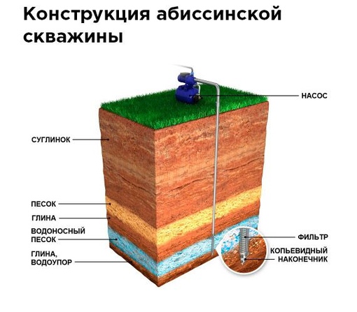 Абиссинский колодец представляет собой так называемую скважину-иглу, заглублённую в землю без обсадной трубы.
