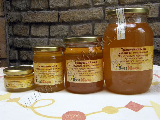 - мед желтой акации, отличающийся нежно-лимонным оттенком, в меру сладким вкусом и легким ароматом;