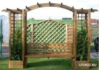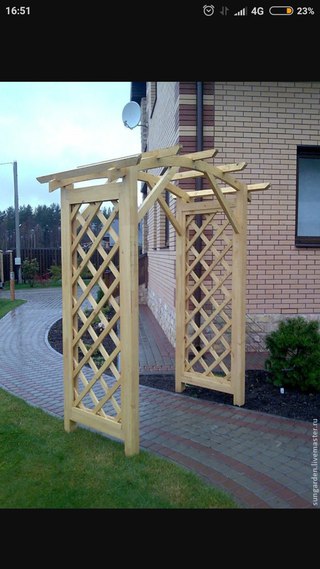 Такие простые конструкции легко сделать своими руками, используя любую древесину. Готовые сооружения оплетаются вьющимися растениями, что выглядит очень привлекательно.