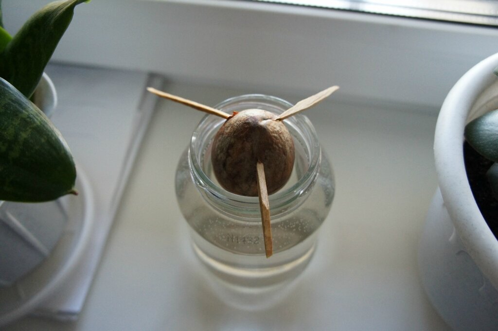Наполните стеклянную или каменную банку водой и подвесьте семена над стеклом с помощью зубочисток. Положите косточку авокадо острой узкой частью вверх. Семя необходимо погрузить в воду примерно на 1/2 — 1 дюйм.Поместите банку с семенами в солнечное теплое место и поддерживайте уровень воды.