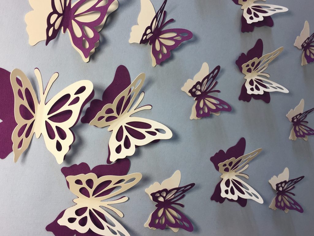 Крепятся они с помощью мыльного раствора. А также применяются в создании открыток. Чтобы сделать такое украшение, используют шаблоны бабочек из бумаги, по которым и вырезают свои изделия.Фигурных бабочек можно вырезать также с помощью плоттера. Это такой специальный инструмент. Тогда вы, конечно, потратите гораздо меньше усилий и времени на их создание, если вам нужно большое количество украшающих элементов.