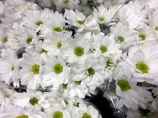 - Хризантема Бакарди Белая (Bacardi White Chrysanthemum). Кипенно-белый окрас соцветий, представленный на фото выше, делает ее очень похожей на ромашку и популярной в составлении свадебных букетов. Отличие хризантемы кустовой Бакарди белой в окраске сердцевины цветка. Если у ромашки она желтая, то у Бакарди Уайт ― зеленая. Кроме того, лепестки хризантем более крупные и округлые.