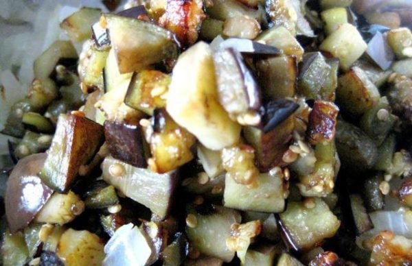 - Обсмажені баклажани змішуємо в окремій піалі із цибулею.