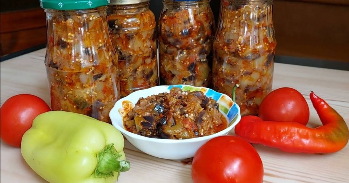 Взять 2 синих фрукта, нарезать кружочками толщиной 2-3 сантиметра. После удаления горечи их обжаривают с двух сторон на растительном масле. Стручки болгарского (3 шт.) и острого перца (1 шт.) чеснок измельчить в блендере. Добавьте 1 столовую ложку сахара, 2 трети соли, 2 столовые ложки уксуса. Все смешанные. Выдержав полчаса, разложить в банки кружочки перца, сверху – острую приправу. В конце заготовку стерилизуют на водяной бане и закатывают крышками.