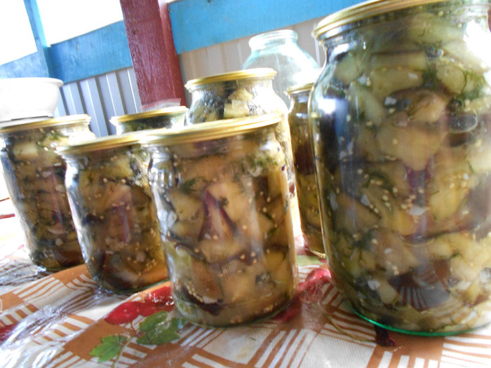 Из указанного количества компонентов у меня вышло две баночки по 700 миллилитров. Хранятся такие баклажаны несколько месяцев.