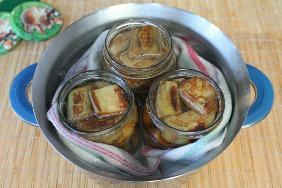 - Запеченные баклажаны раскладываем по заранее простерилизованным банкам.