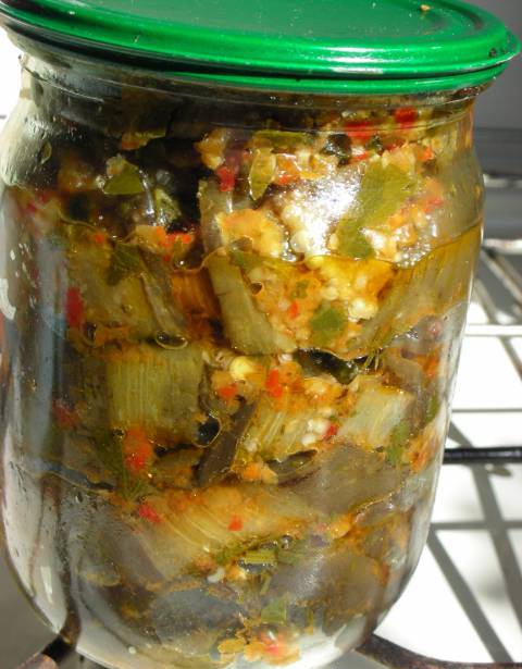 Маринад, приготовленный для того, чтобы быстро замариновать синенькие, и оставшийся после завершения консервирования, можно добавлять в салаты из свежих овощей вместе с растительным маслом в качестве заправки.