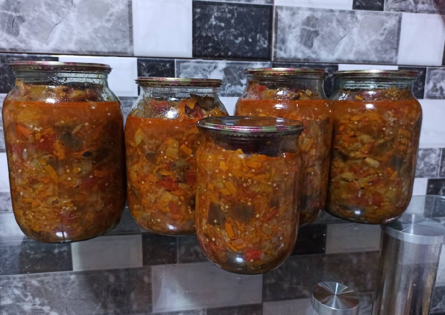 - В простерилизованные банки укладываем пестрые ингредиенты в такой очередности: баклажаны, зелень с чесноком, морковно-луковая зажарка, томатный маринад – и так до самого верха. Маринад должен покрыть содержимое стеклянной тары, поэтому важно, чтобы именно он стал завершающим слоем.