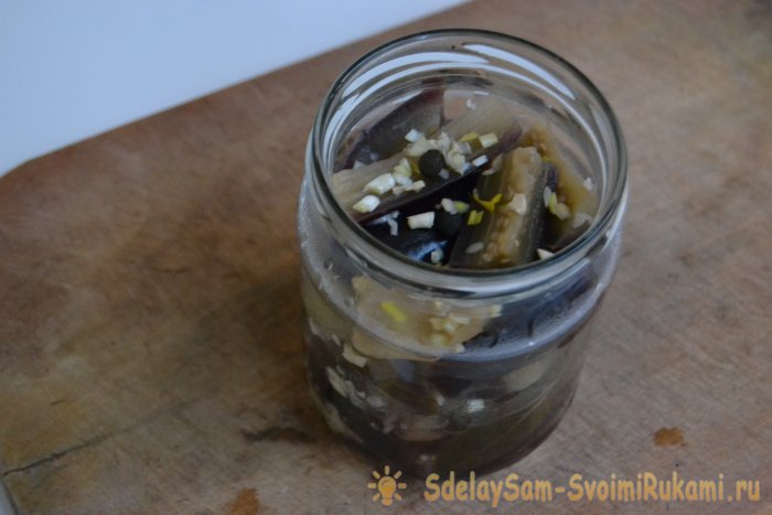 На дне емкости с баклажанами будет сок. Я его разливаю по банкам в конце, чтобы каждой баночке досталось одинаковое количество маринада.