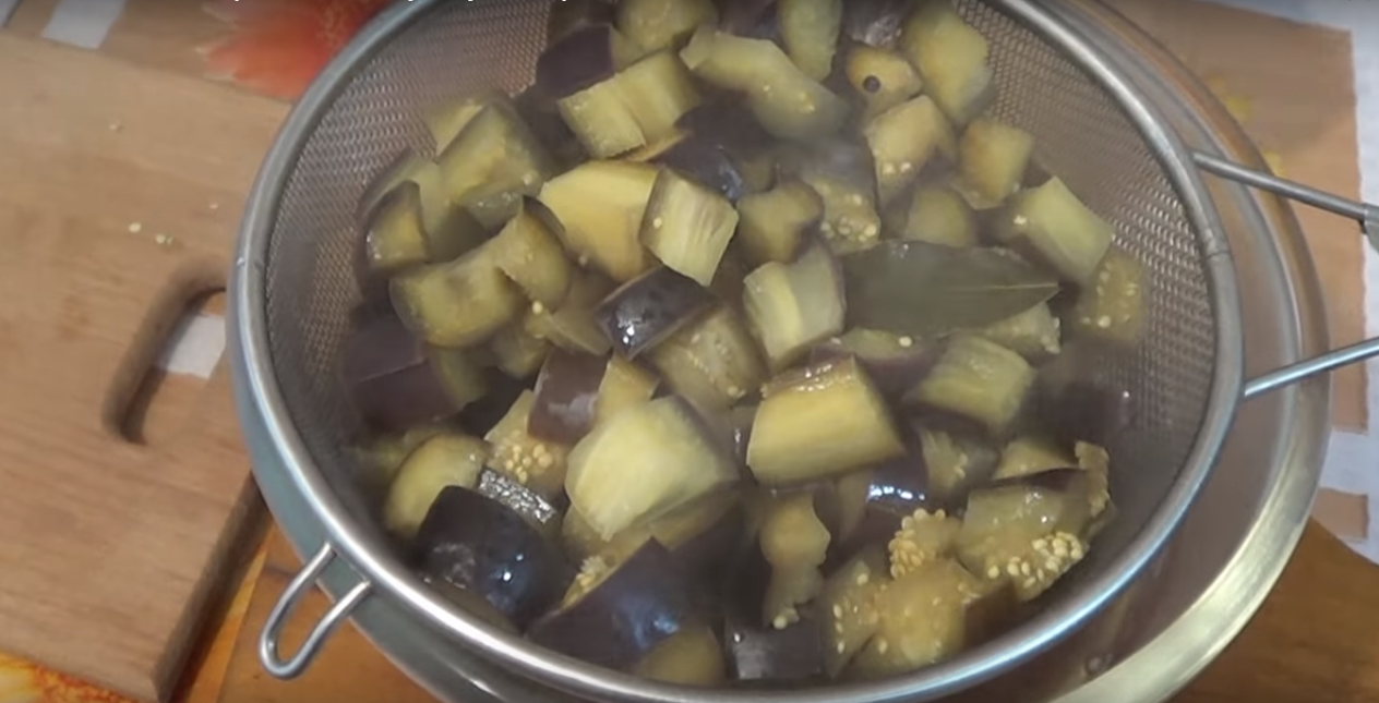 - Синенькие ополоснуть, освободить от плодоножек. Целиком опустить на 5 минут в закипевшую солёную воду. Прижать крышкой.