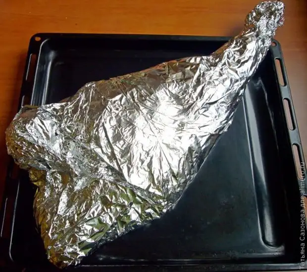 - Плотно заворачиваем фольгу, чтобы воздух не поступал. Ставим мясо в духовой шкаф на 45-50 минут.