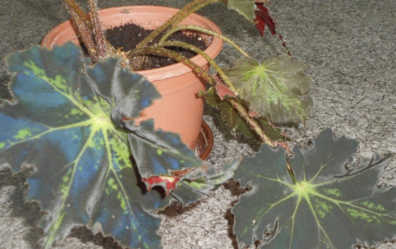 Иногда бывает, что листовые пластины начинают засыхать. Причина этого в том, что в помещении слишком теплый и сухой воздух, а также чрезмерно скудный полив. В этом случае следует произвести полив бегонии и поставить ее в прохладное место, горшок поставить на перевернутый поддон (подробности см. Выше).