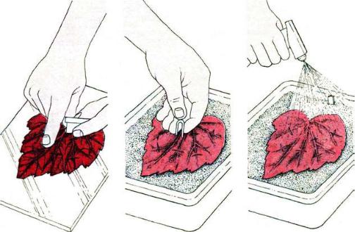 Многие виды бегоний начинают с черенкования листьев. Все части листа способны укореняться и образовывать новое растение. Единственное требование — листовая часть должна содержать главную жилку.