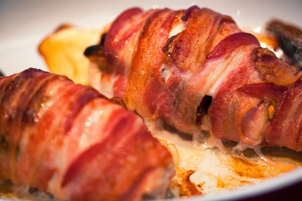 Приготовление: Промой шампиньоны и удали ножки. Мелко нарежь грибные ножки, натри сыр на терке, измельчи чеснок, и смешай все с мягким сливочным маслом и сливками. Выложи массу в грибные шляпки и каждую заверни в полоску бекона. Отправь их в духовку на 15-20 минут при 190 градусах.