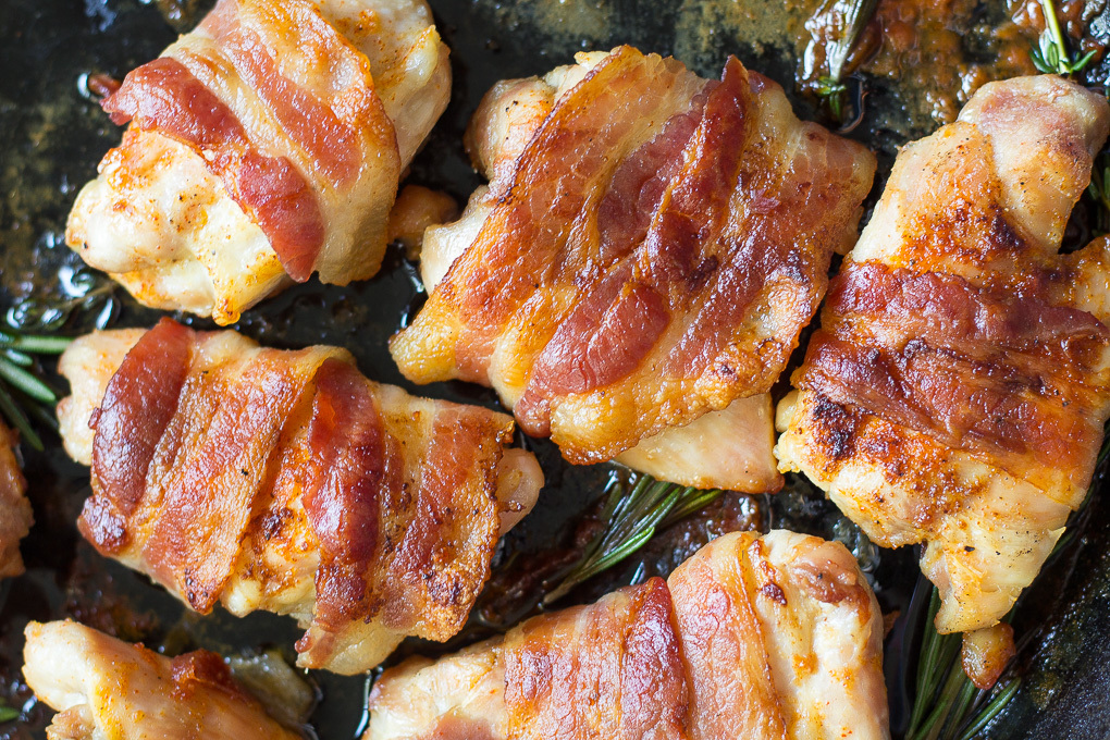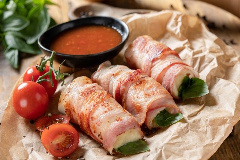 Приготовление: Нарежь филе индейки, отбей и посыпь специями. Положи каждый кусочек на ломтик бекона и сверни рулетики. Скрепи их зубочистками и запекай в духовке 15-20 минут при 200 градусах.
