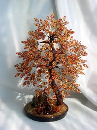Рассмотрим упрощенный способ плетения. Сперва создается из проволоки 5 штук веточек с семью камушками – для верхушки. Для второго яруса – 8 ветвей с девятью драгоценностями и третий ярус, состоящий из 12 веточек с одиннадцатью камнями. Далее соединяются гроздья между собой по группам и формируется большое “счастье”. Корешки разделяются в стороны по частям в форме лучиков, затем скручиваются для подставки. В заключении оформить созданное творение возможно разными способами: на деревянной подставке, украсив декоративным мхом или загипсовать в неглубокую емкость и поверхность декорировать на свой вкус.
