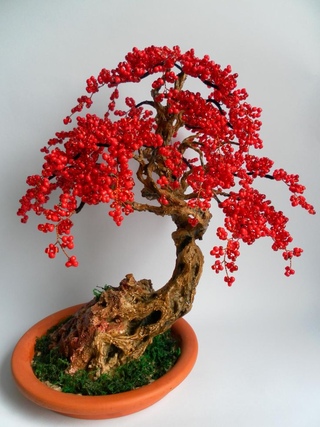 Необычайно красивое, плетется самым простейшим способом на основе петельной техники и выглядит красиво. Создается небольшое количество веточек, между собой скручиваются и формируется древо, также возможен вариант сфантазировать что-то свое. Главный акцент в этом, что материал для бисероплетения нужен красного цвета.