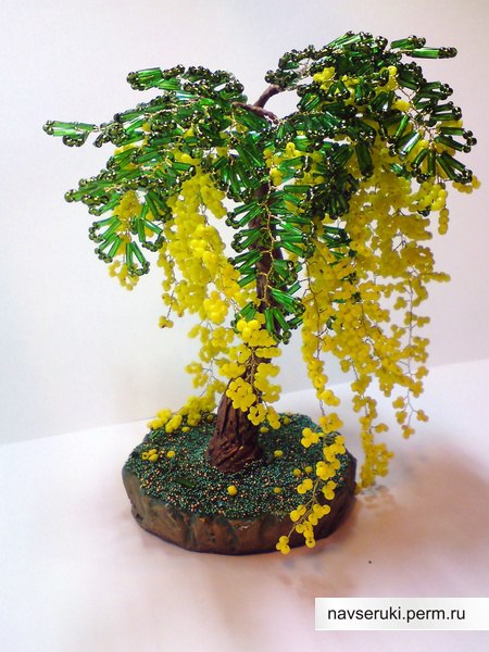 Очень интересная и легкая техника у этого дерева. Процесс состоит из того, чтобы, нанизав на проволочку бисеринки, далее их прокручивать по одной штучке в один ряд. Изготавливают много ветвей ивы (от 200 – 500 штук), затем их собирают воедино, прикрепляется ствол и оформляют на подставку.