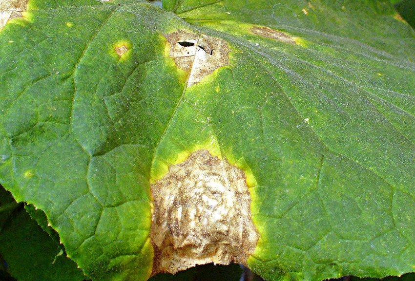 Симптомы. На внешней стороне листа появляются пятна светло-желтого цвета. Спустя некоторое время они начинают расползаться, вначале полностью покрывая листовую пластину, а затем перебираясь на остальные вегетативные части куста. На обратной стороне листьев появляются мокрые пятна фиолетового цвета. Некоторые начинающие садоводы путают заболевание с солнечным ожогом на самых начальных этапах его развития.