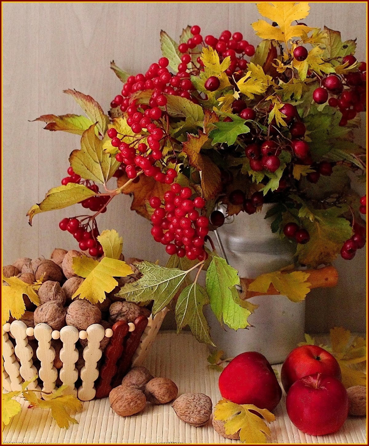 Осенний натюрморт с рябиной и яблоками