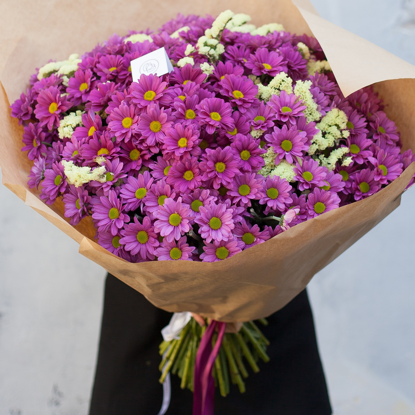Благородные хризантемы придают букетам элегантную простоту и лаконичность. Их часто сочетают с розами, чтобы нейтрализовать романтический подтекст, а также с герберами и подсолнухами.