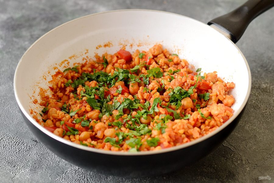 Затем смешать его с овощами, зеленью, нутом и специями.