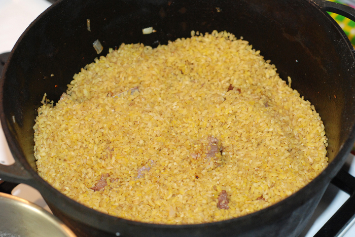 Наливаем в нее 3-4 ст.л. растительного масла. Можно заменить 50 граммами сливочного масла. Разогреваем на огне. - Промываем булгур в холодной воде. Затем отправляем в кастрюлю, добавив соль. Прогреваем на огне минуту, чтобы вся крупа покрылась маслом.