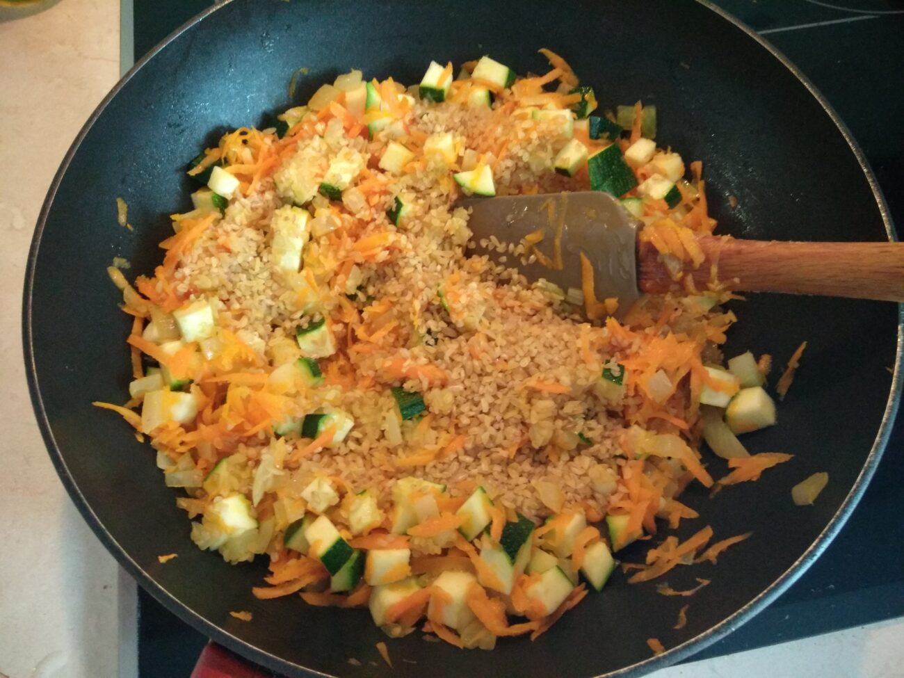 Добавьте к овощам и сухую крупу булгура для гарнира. Продолжайте обжаривать и помешивать.