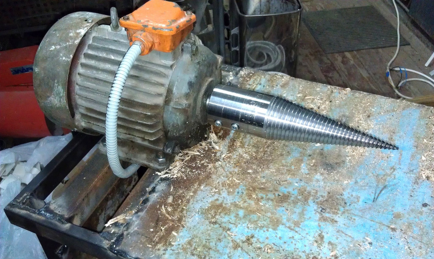 Как вы сами смогли убедиться, изготовить винтовой дровокол своими руками несложно. Конечно, если есть возможность найти все вышеперечисленные детали к станку. Но есть вариант более простой. Для него нет необходимости использовать редуктор и подшипники, промежуточный вал и сложную станину. Все, что вам потребуется, это двигатель и винтовой конус. Чтобы вы поняли, о чем идет речь, посмотрите на фото ниже, где показан этот простой дровокол.