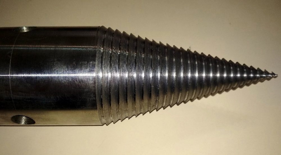 По сути, с помощью резьбы выполняется дополнительное движение заготовки – поступательное. При том, как сам рабочий орган вращается. Это очень важно для конусных дровоколов (220 вольт) бытового типа, потому что у них будет отсутствовать подающий узел. Все будет производиться вручную. Именно этот вариант создаст условия, при которых не нужно будет использовать большое давление на разрезаемую деревянную чурку.