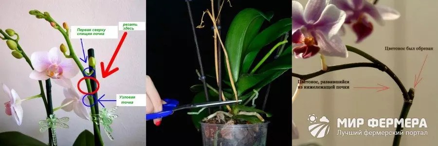 У фаленопсиса с зеленым цветоносом отрезают верхнюю часть, оставляя нижнее междоузлие с одной спящей почкой. Иногда цветочную стрелку оставляют полностью, она может нарастить верхний кончик.
