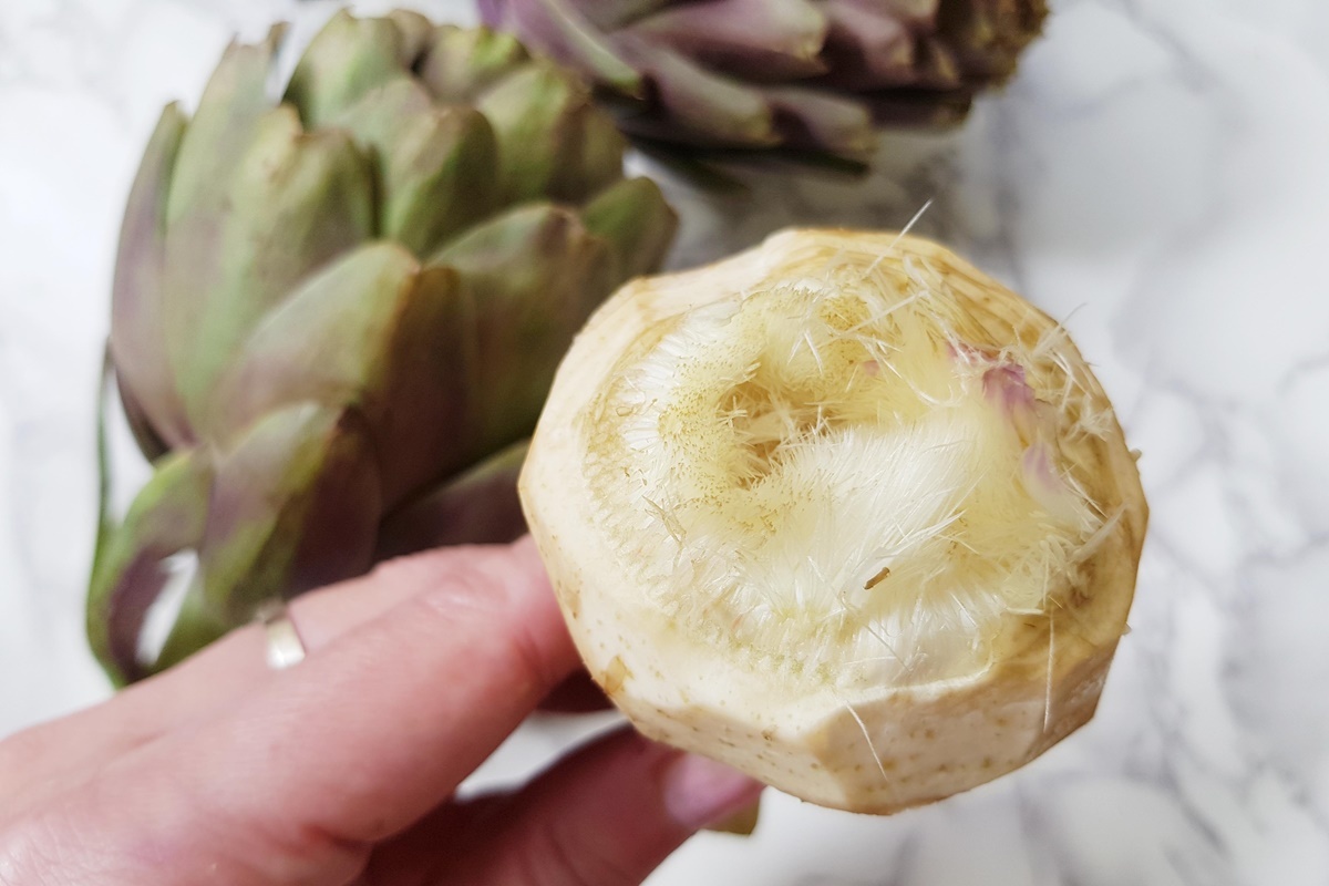 - Удалите чок, похожий на чертополох, и маленькие пурпурные листья, покрывающие его, с помощью чайной ложки после приготовления.