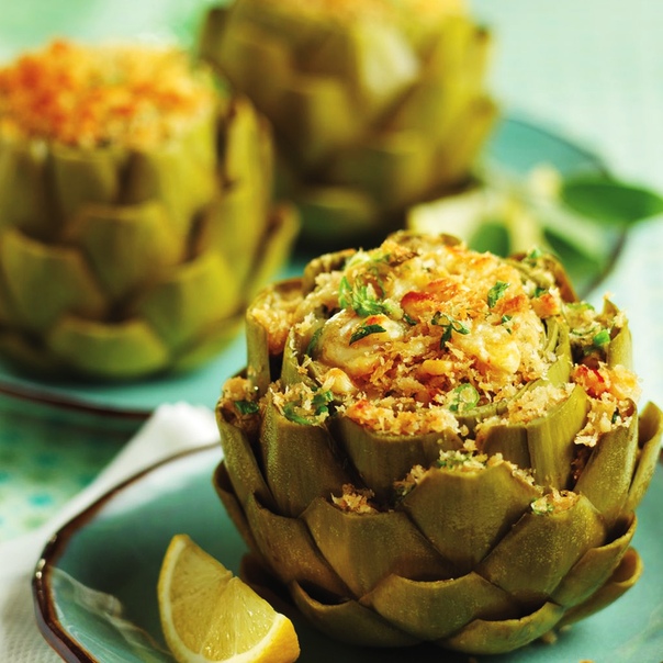 Фаршировать вареные артишоки рисом, мясным фаршем, колбасой, курицей, овощами, сыром или их сочетаниями и запекать до образования пузырьков.