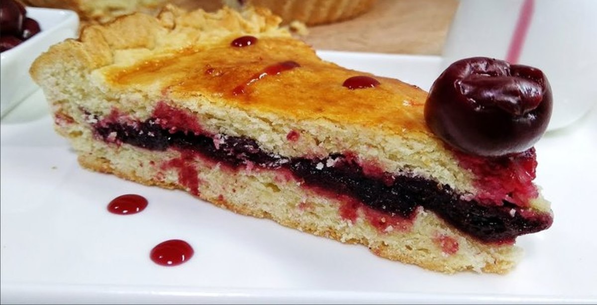 Выложите его на смазанный маслом противень, обсыпьте орехами, на орехи выложите вишню, равномерно обсыпьте её сахаром и посыпьте крахмалом через сито. Сверните пласт теста рулетом, защипните края и запекайте в разогретой до 150ºС духовке 20 минут.