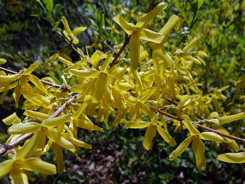 Форзиция европейская. Кустарник с прямостоящими ветвями высотой до 2 м растет на горных склонах Албании. Он хорошо переносит морозы и любит солнце. Ветки покрывают зелёные листочки с ровными краями длиной 5-7 см. В мае распускаются желтые цветы, собранные в группы по 2-5 штук. Диаметр колокольчика составляет около 4 см.