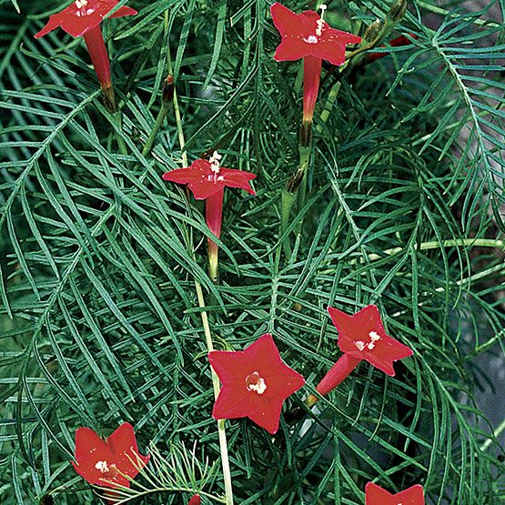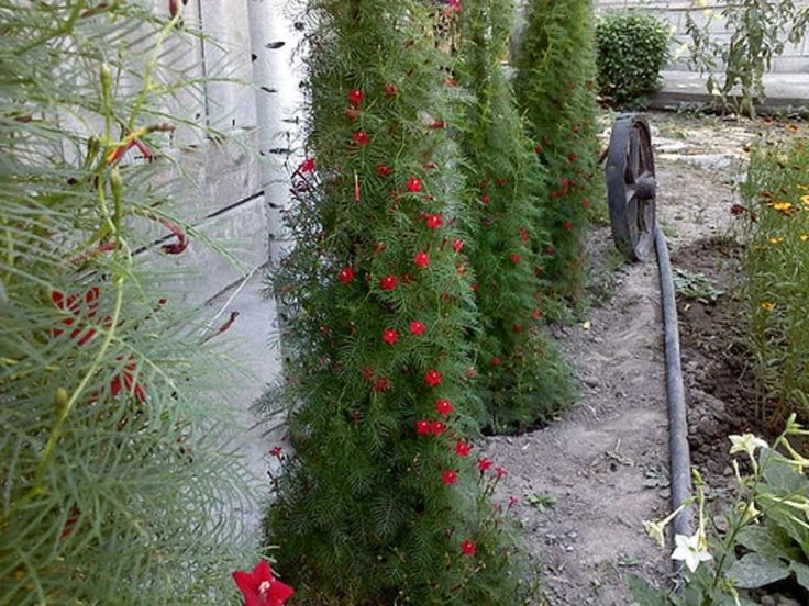 Красный квамоклит растёт невероятно быстро и стремительно. Он направляется вверх, обвивается вокруг опоры тоненькими стебельками. Квамоклит перистый пришёл к нам из Мексики и Южной Америки. Удивительный однолетник растёт в тропиках.