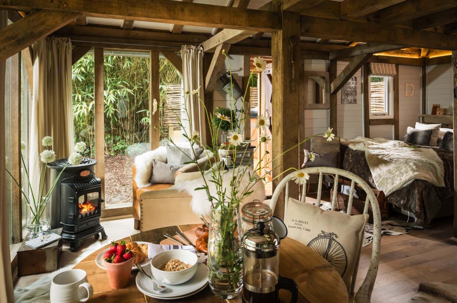 Гостиная коттеджа демонстрирует высокий потолок с открытыми балками белого цвета и натуральным деревом, гармонирующим с широким дощатым полом. Он обставлен удобными сиденьями и журнальным столиком из темного дерева над джутовым ковром, установленным напротив углового камина.