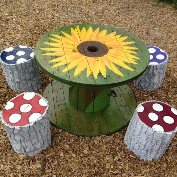 По всей территории уместно разместить небольшие пни с красивыми текстильными подушками – получатся удобные места для отдыха.