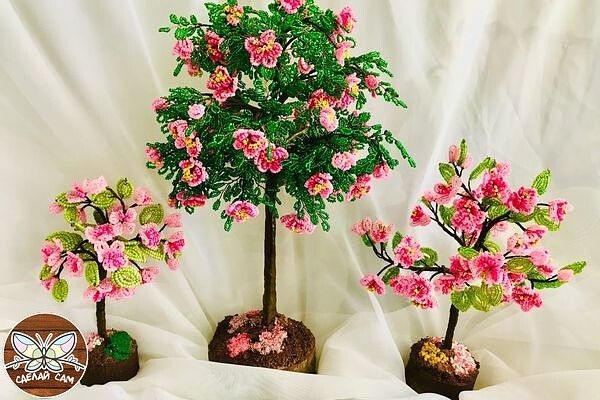 Сегодня хочу предложить сделать своими руками цветущую яблоньку из бисера. Дерево получается очень красивым и может послужить в качестве оригинального подарка. Когда будете знать основы плетения деревьев, таким способом можно будет выполнить любое