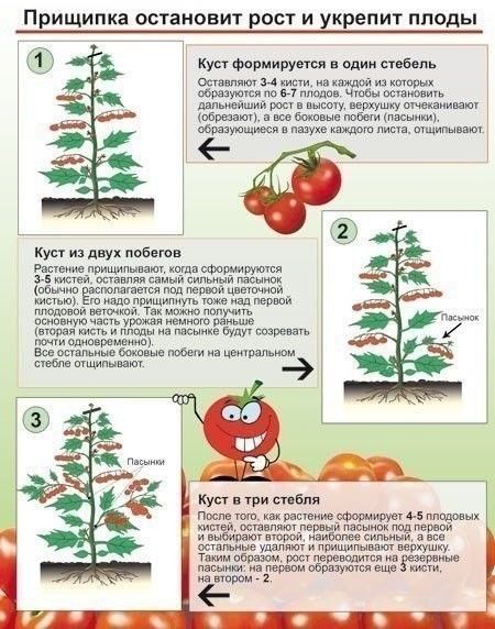 На заметку. Если выращивается детерминантный сорт томатов, то это не значит, что ему не нужны подвязка и пасынкование. При отсутствии этих приемов куст будет формироваться неправильно. Детерминантное растение, перегруженное мелкими плодами, не принесет желаемого урожая. Это не относится к штамбовым сортам.