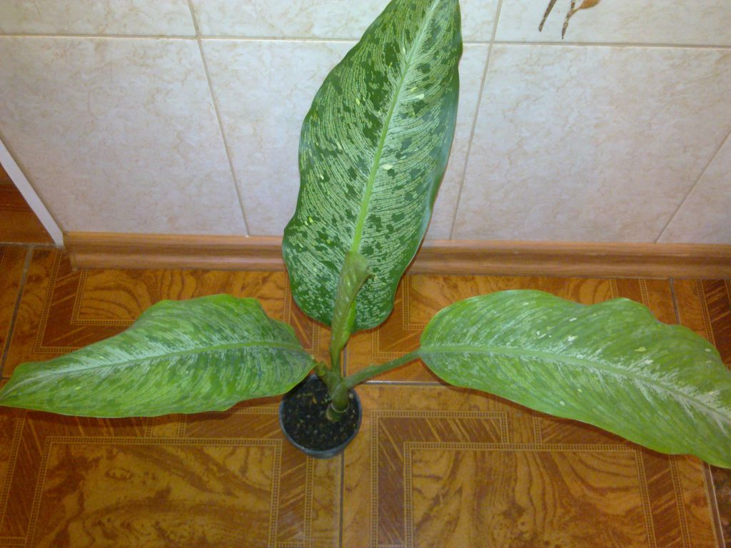 Листья диффенбахии зелёные, крупные (до 50 см), эллипсовидные, с белыми прожилками по центру. Сорт отличается теневыносливостью, легко приспосабливается к неблагоприятным условиям, отлично растёт в домах с центральным отоплением.