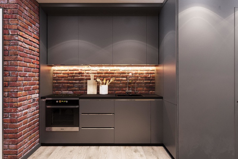 Такой способ обустройства будет отличным решением для тех хозяев, которые не будут постоянно готовить, потому как площадь рабочей поверхности у линейной планировки на порядок меньше, нежели у угловой или иных подобных типов.
