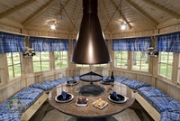 Они обязательно имеют все стены, застекленные окна и больше похожи на обособленные однокомнатные домики. Строительство однозначно имеет постоянный, а не временный характер. Более того, конструкция рассчитана как на летний, так и на зимний отдых. В редких случаях владельцы продумывают установку полноценной отопительной системы, значительно чаще ее «по старинке» заменяют на печку или камин. Удобство от наличия очага в помещении очевидно: он создает уютную обстановку и комфортный отдых в холодное время года. При необходимости в этой беседке могут ночевать гости, на которых не хватило спальных мест в основном доме. Единственный нюанс заключается в необходимости заготавливать дрова.