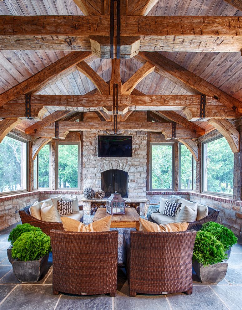 Деревенские беседки сооружают исключительно из дерева по принципу сруба, то есть используют бревна. Желательно, чтобы материал был минимально обработан, таким образом подчеркивают колорит глубинки. В качестве опорных столбов можно использовать очищенные от коры деревья-рогатки (у которых двойные стволы). Внутреннее убранство будет состоять из грубого стола и пары лавок. Украсить конструкцию можно резьбой с традиционными русскими мотивами.