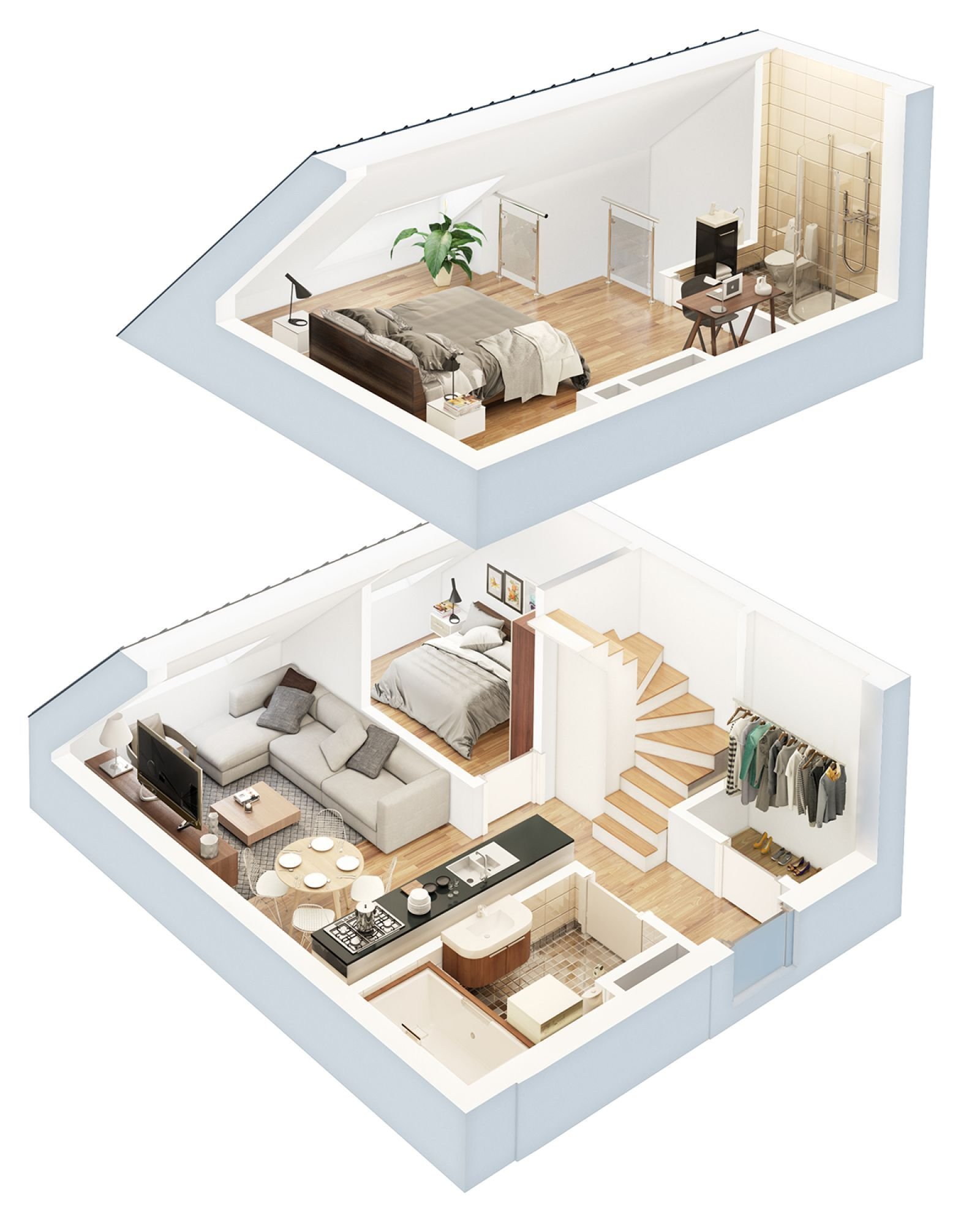 3D-планы этажей — это схема, показывающая планировку дома или собственности в 3D. 3D означает, что план этажа показывает как перспективу, так и высоту. В отличие от 2D-плана этажа, 3D-план этажа содержит больше деталей и облегчает понимание пространства.