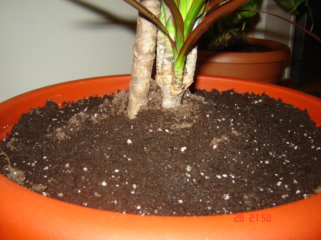 - В новом горшке корни растения тщательно засыпают специальным грунтом для пальм и драцен.