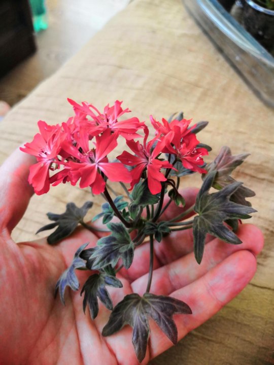 Нельзя не заметить цветение махровой пеларгонии Лотта Лундберг. Словно сияющие насыщенного розового оттенка звездчатые цветки собраны в круглые плотные соцветия.Сильные коричневатые цветоносы и выразительные листья с темной зоной только добавляют этому сорту декоративности.